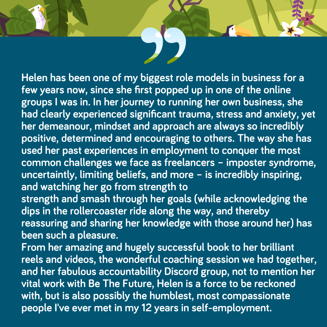 1:1 coaching with Helen was a complete gamechanger for me. I'd been part of group coaching programs before but the difference between those and what Helen offers was night and day. Helen is so empathetic and just *gets it*. After every session I'd come away filled with clarity and enthusiasm. Helen is extremely talented at gently guiding you towards creating a business that works for you — no generic advice here! She was so supportive and encouraging as I broke down barriers around money mindset, self-worth, and all sorts of personal factors which I hadn't really associated as having an impact on my business... but of course they do, because I AM my business. Being accountable for taking action and then discussing how it went was also incredibly valuable for me. This has been my best year in business to date, and I have no doubt that my coaching sessions with Helen have played a huge part in that. She's the best!